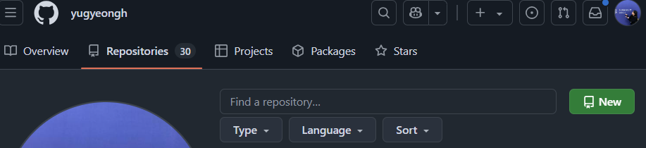 GitHub에서 본인 프로필에 들어가시면 repository 탭이 있습니다. 여기서 new를 클릭해 주시면 새로운 remote repository(원격 저장소)를 생성할 수 있습니다.