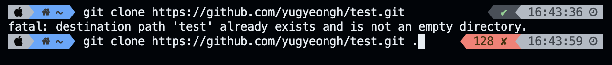 💡 여기서 주목해야 할 점은 .(온점)의 유무입니다. - git clone https://github.com/yugyeongh/test.git 현재 위치한 경로에 test라는 폴더를 만들기 - git clone https://github.com/yugyeongh/test.git. 현재 위치한 경로에 test 안에 있는 폴더들 혹은 파일들을 풀기