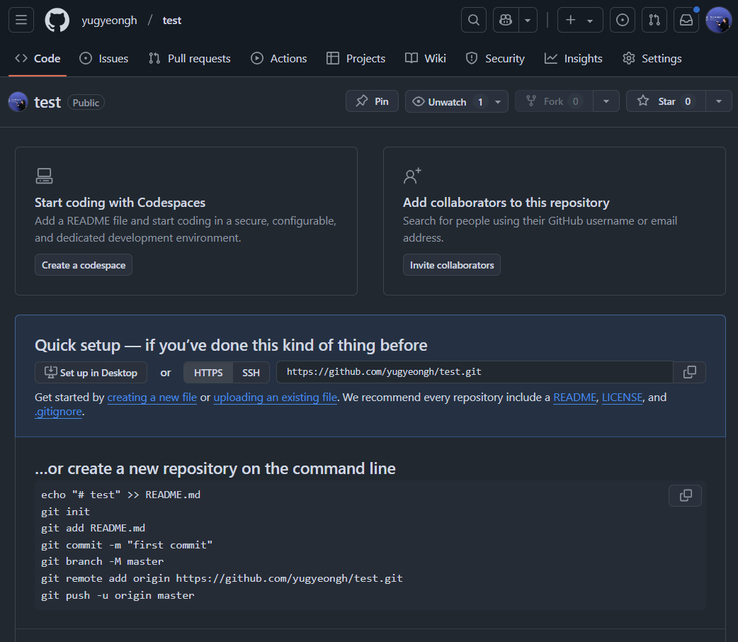 저는 레포 이름은 test, description은 작성하지 않았고, public 레포 설정, readme와 .gitignore는 포함하지 않았습니다.