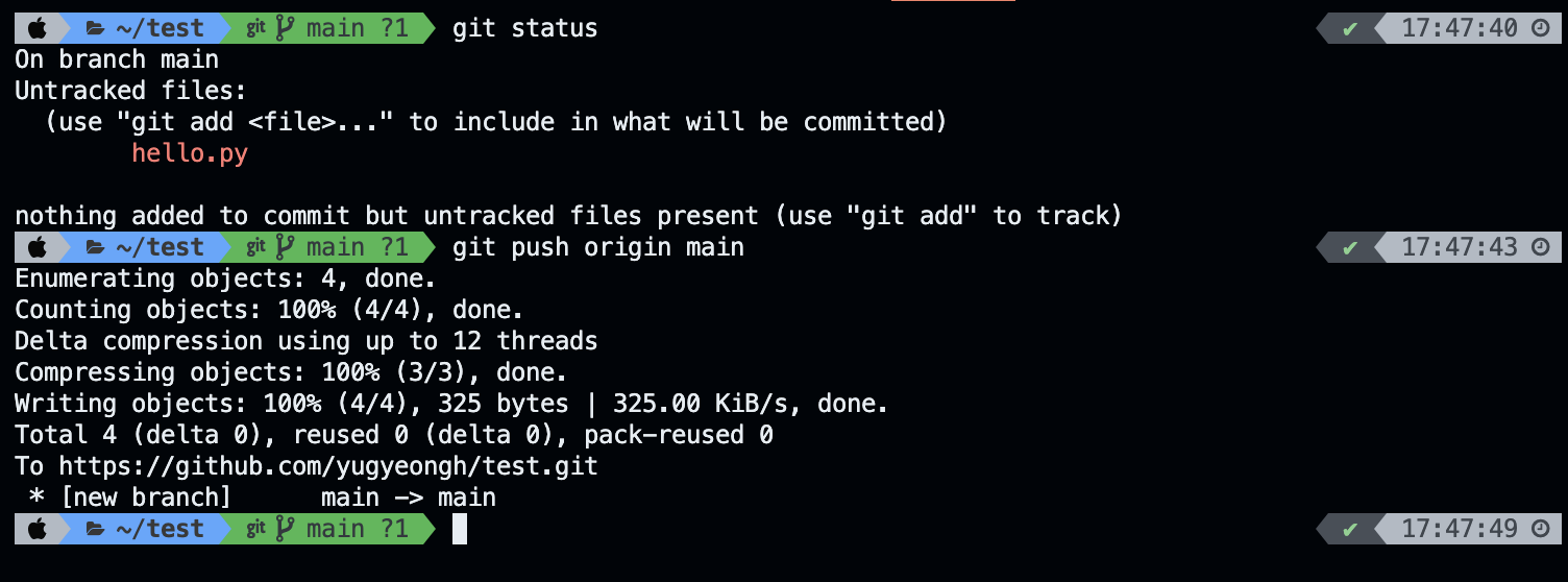 이렇게 원격 레포지토리가 연결된 상태로 이제 본격적으로 깃허브에 코드 올리는 명령어를 알아보겠습니다.
