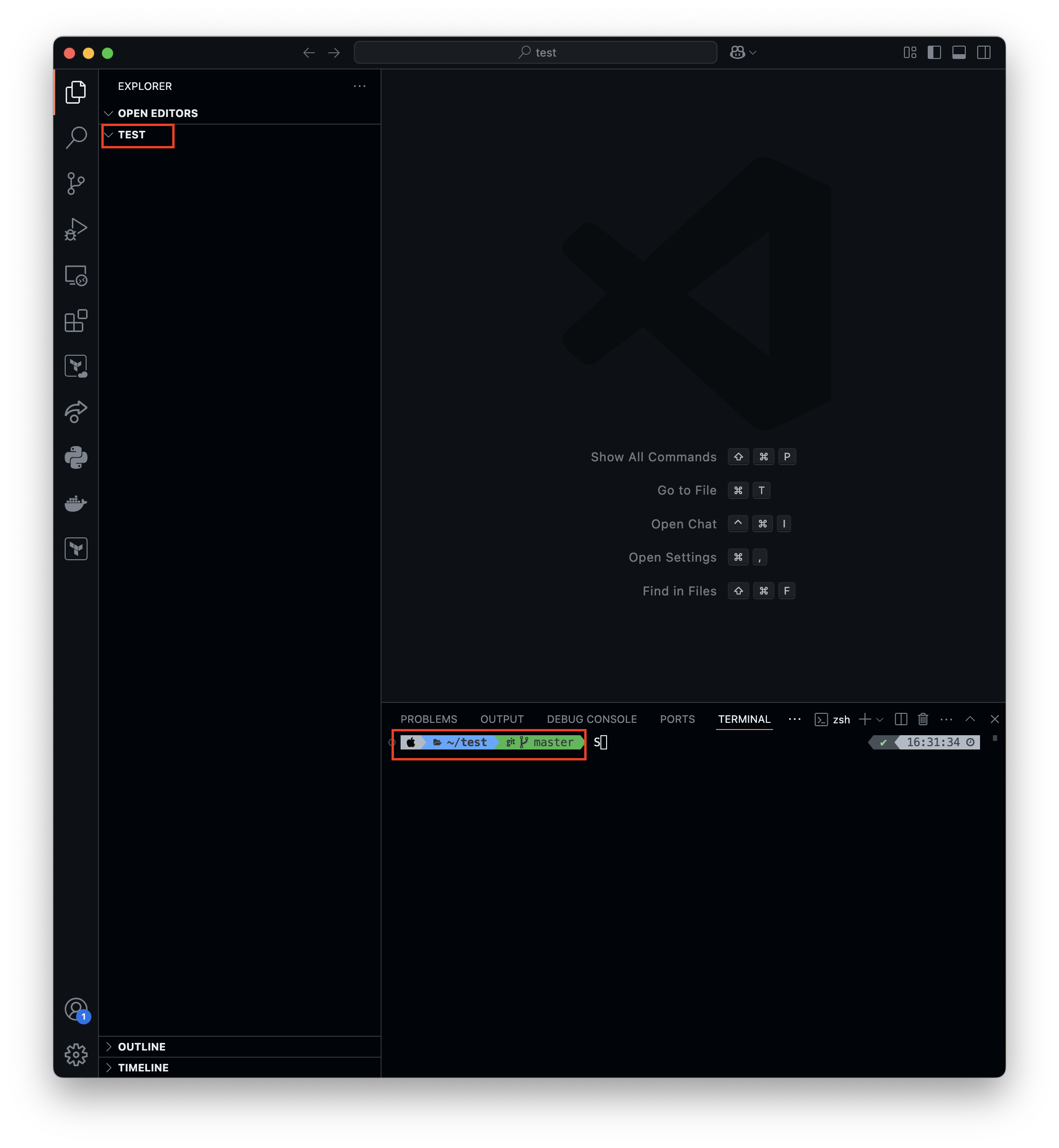그럼 이제 네모박스처럼 test라는 폴더가 열린 것을 볼 수 있습니다. 터미널을 확인해도 test 디렉터리로 들어와 있음을 알 수 있습니다. 터미널을 여는 방법은 ctrl + shift + ` 입니다. 그리고 터미널에서는 master 브랜치인 것을 볼 수 있는데 github 원격 레포의 default 브랜치로 설정이 된 것입니다. 만약 main으로 나오신다면 해당 레포의 default 브랜치가 main이라 그런 것이니 저와 다르다고 이상한 것이 아닙니다!