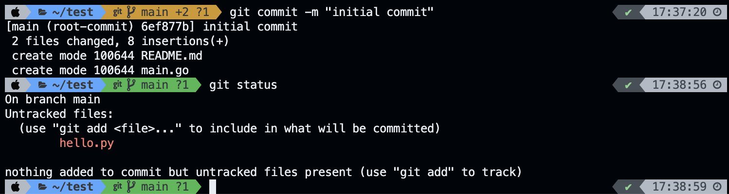 git commit 명령을 사용해 commit 했습니다. 커밋한 후 status를 확인하면 new file에서 README.md와 main.go가 사라진 것을 볼 수 있는데요, commit이 되어 박스에 담겼기 때문이라고 생각해 주시면 됩니다.