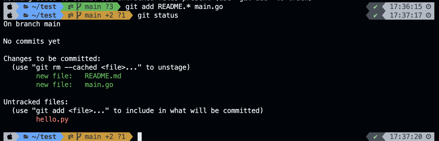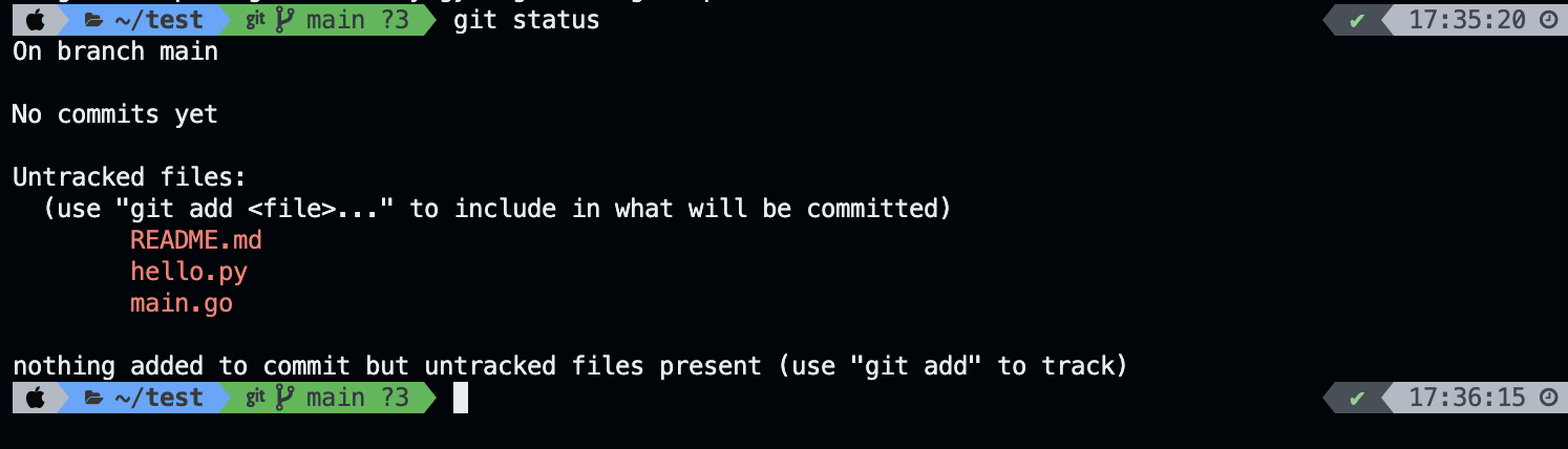 git status를 통해 상태를 확인해 주니 new file로 README.md와 main.go 파일이 생겼습니다. 이제 git에서 README.md, main.go 파일을 추적할 수 있게 된 것입니다. new file 위에 있는 글을 보면 changes to be committed라고 나와 있습니다. 이 두 파일은 이제 커밋을 기다리는 단계가 된 것입니다. 하지만 hello.py는 add 하지 않았기에 git에서 추적할 수 없고, commit을 기다리지도 않는 것입니다.