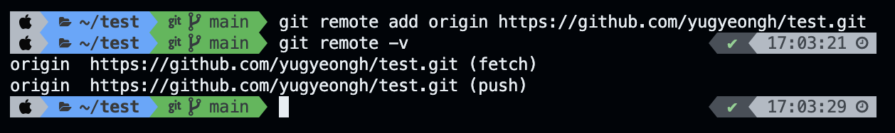 위와 같은 명령어를 입력하면 remote 레포와 local 레포를 연결할 수 있습니다.