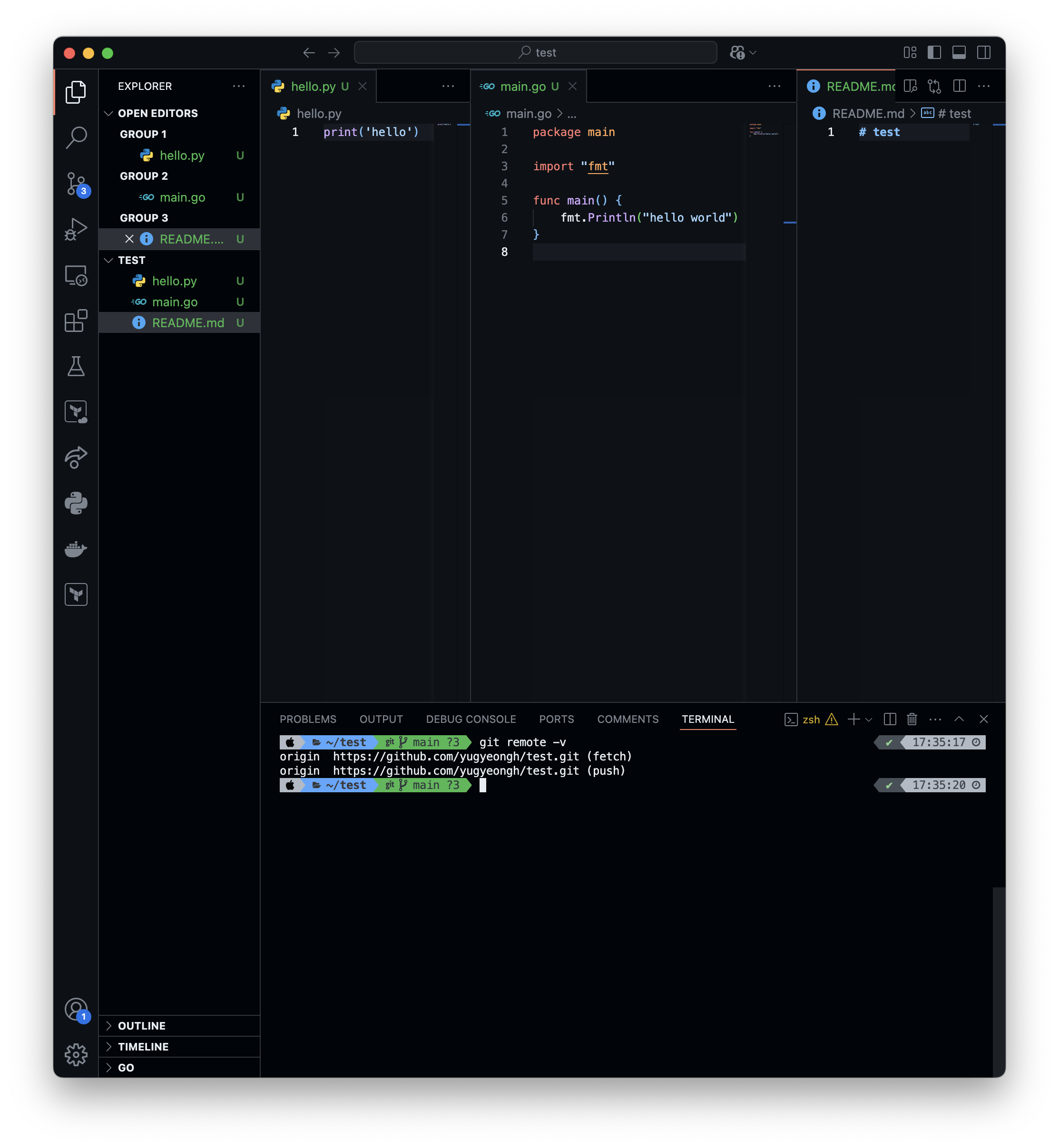 총 세 개의 파일(hello.py, README.md, main, go)을 만들어 보았습니다.