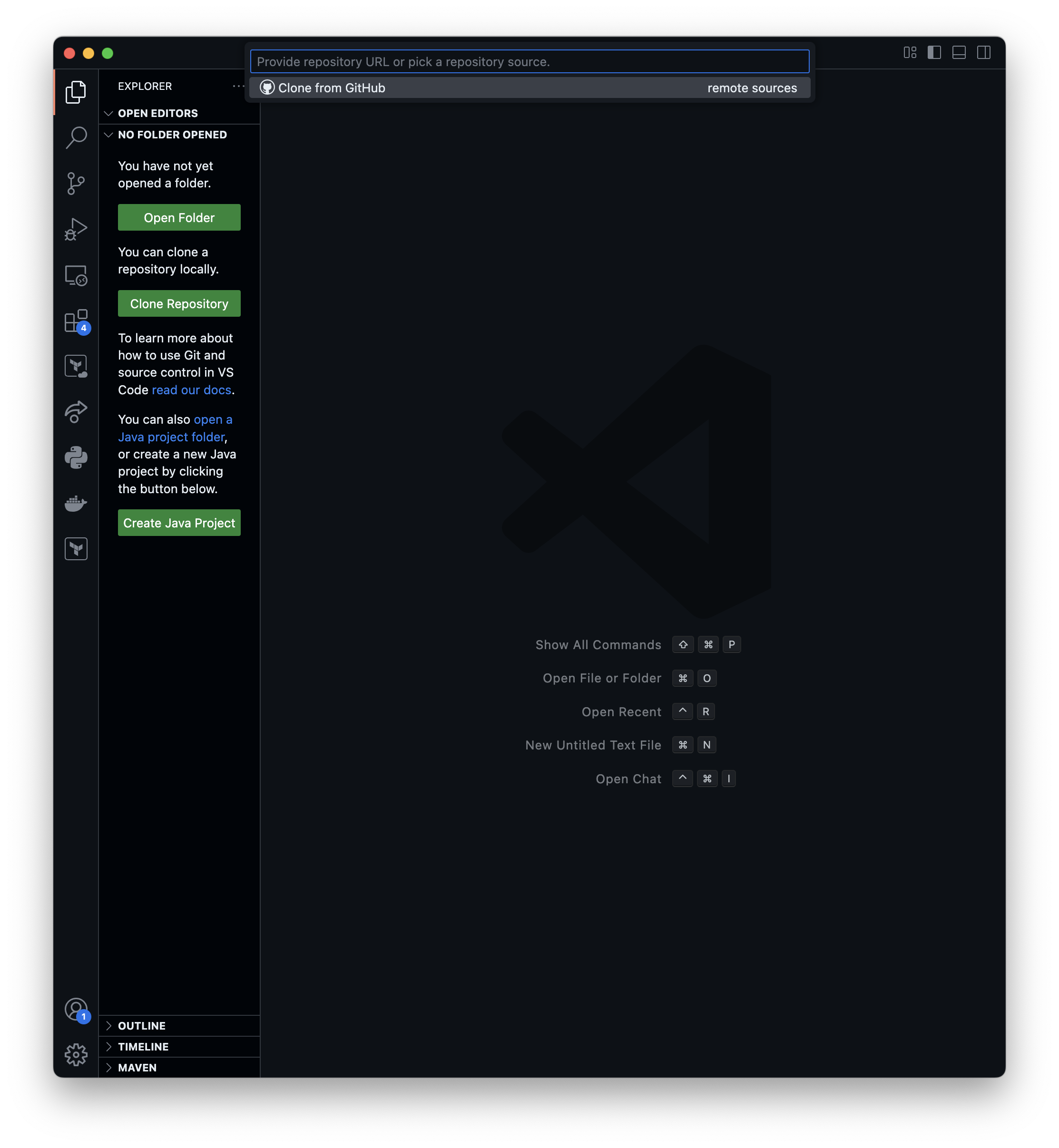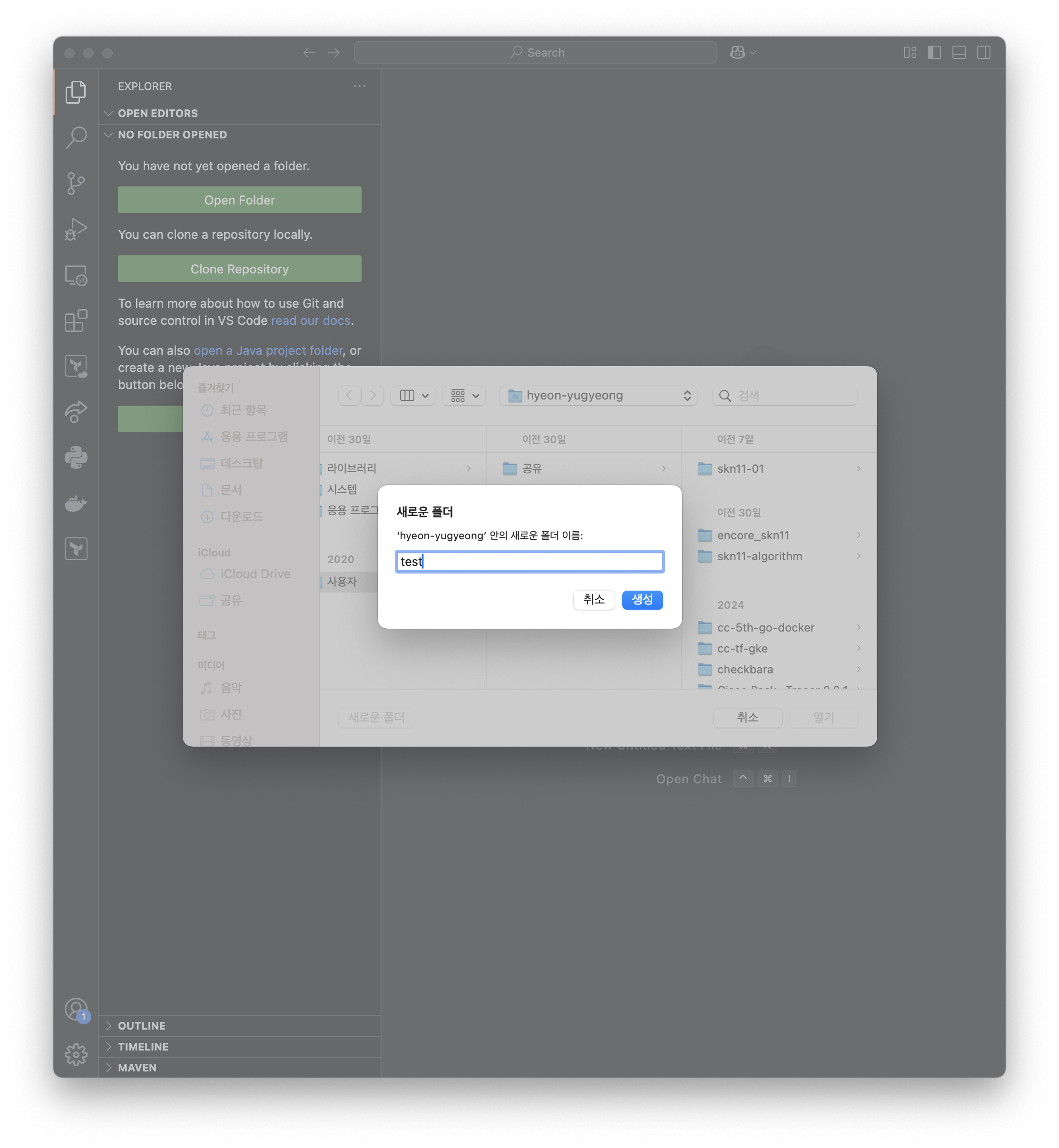 우선 왼쪽 아래 사진과 같이 새로운 폴더를 만들어 주겠습니다. 이미 폴더가 있으신 분들은 생략하셔도 좋습니다. 폴더를 open 한 뒤, 터미널을 열어보면 위에서 봤던 터미널과 달리 master 브랜치에 연결이 되어 있지 않습니다.