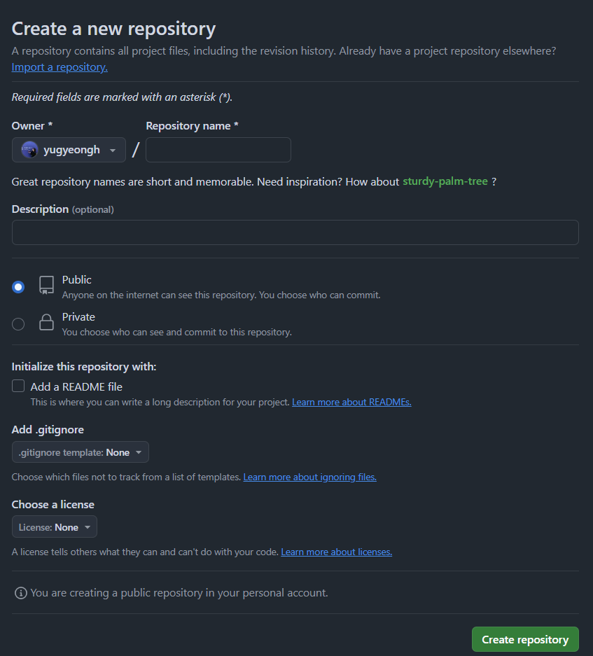 public or private: 레포 공개 옵션 설정