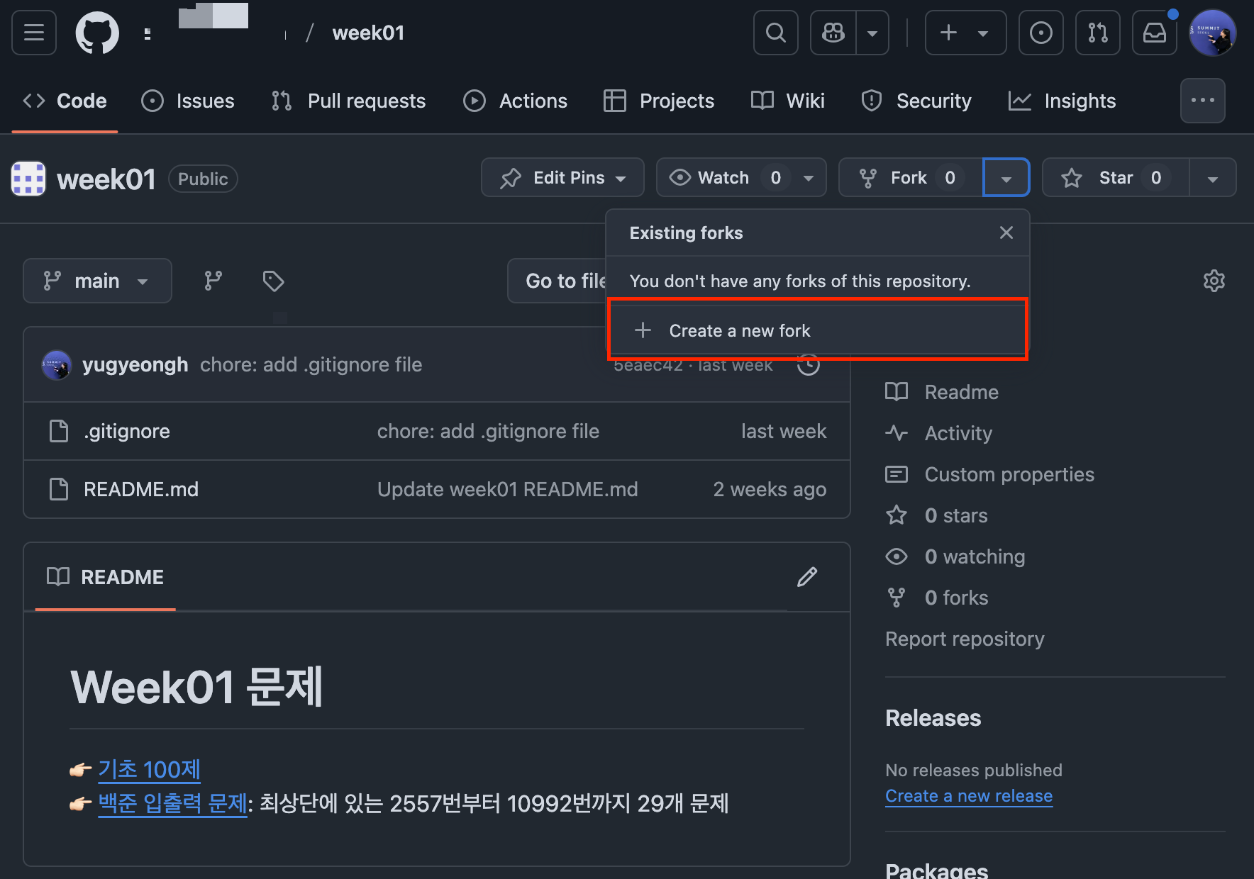 `create a new fork`를 선택하면 레포지토리를 본인의 깃허브로 fork 해 올 수 있습니다.
