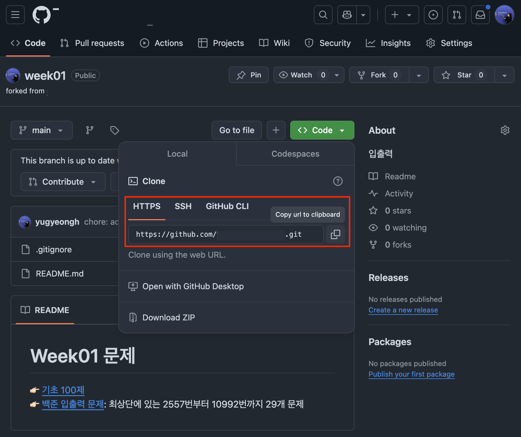 그럼 이제 원격 레포지토리를 clone 해옵니다. 박스 안의 url(원격 레포의 url 주소)을 복사합니다.
