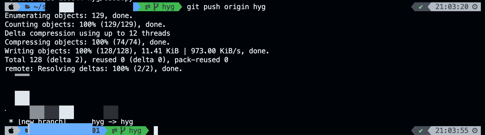 `git checkout -b <브랜치명>`은 브랜치 만들기 + 브랜치 이동을 함께 수행하는 명령어입니다. 따라서 main 브랜치에서 hyg 브랜치로 옮겨진 것을 확인할 수 있습니다.