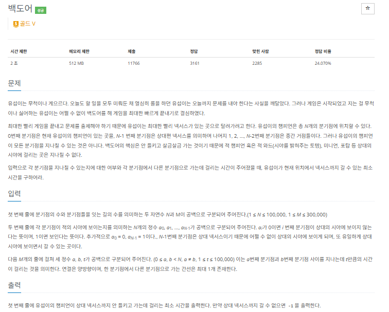 - 출발점에서 도착점까지 가장 적은 시간이 걸리는 경로를 구해야 함